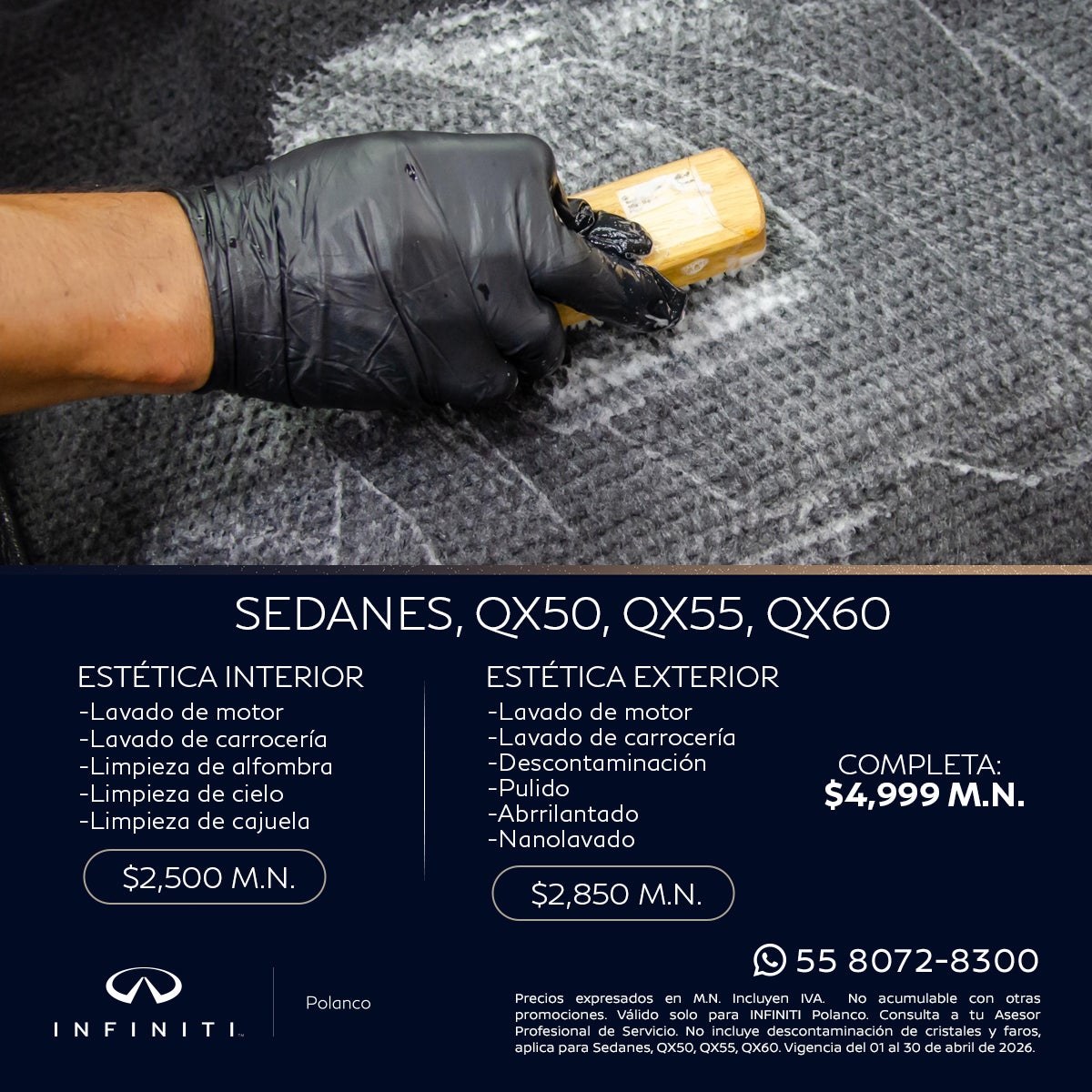 Precios expresados en M.N. Incluyen IVA. No acumulable con otras promociones. Válido solo para INFINITI Polanco. Consulta a tu Asesor Profesional de Servicio. No incluye descontaminación de cristales y faros, aplica para Sedanes, QX50, QX55, QX60. Vigencia del 01 al 30 de abril de 2026.
