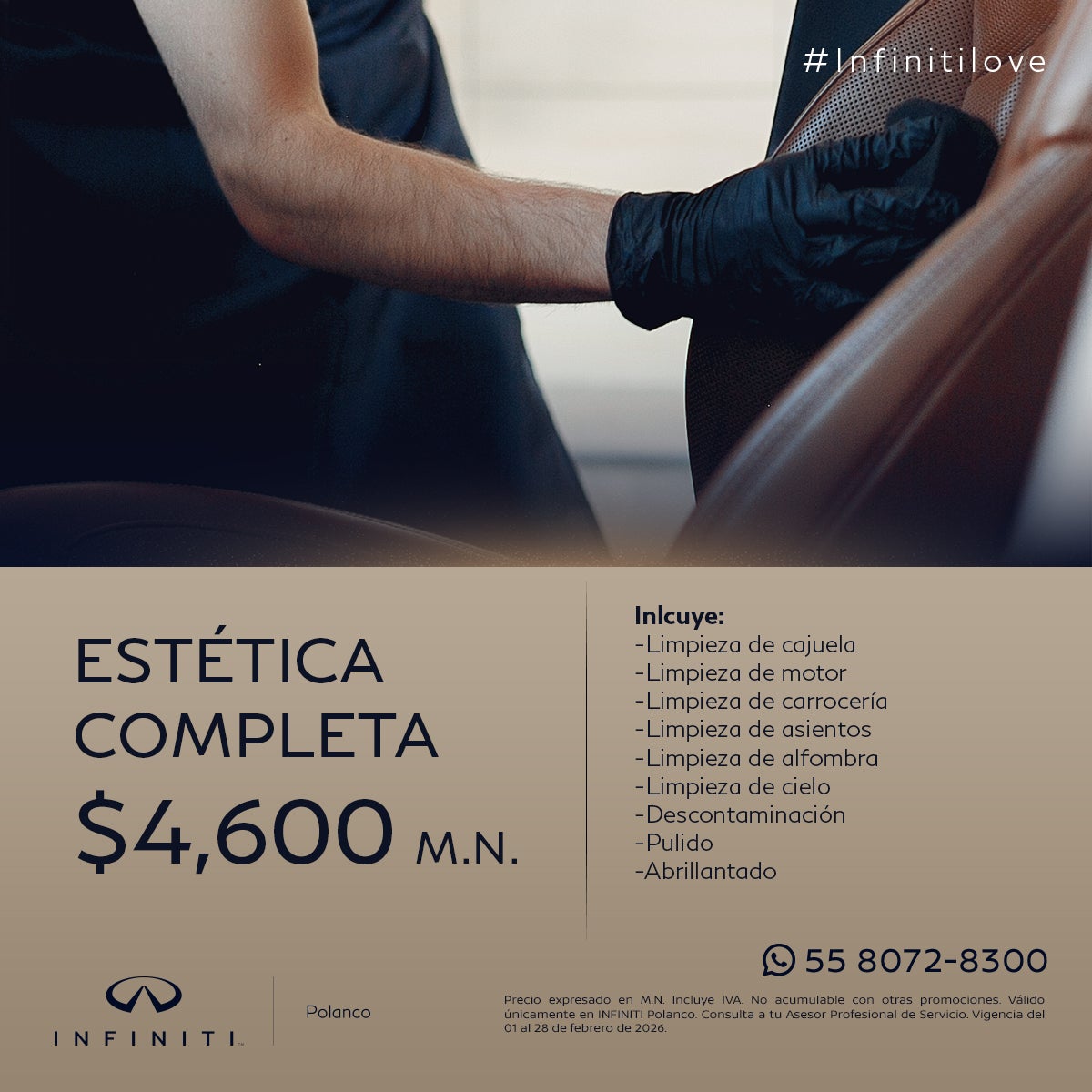 Precio expresado en M.N. Incluye IVA. No acumulable con otras promociones. Válido únicamente en INFINITI Polanco. Consulta a tu Asesor Profesional de Servicio. Vigencia del 01 al 28 de febrero de 2026.