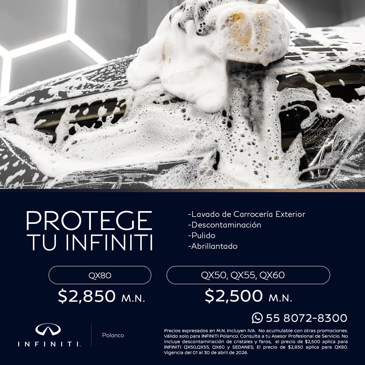 Precios expresados en M.N. Incluyen IVA. No acumulable con otras promociones. Válido solo para INFINITI Polanco. Consulta a tu Asesor Profesional de Servicio. No incluye descontaminación de cristales y faros, el precio de $2,500 aplica para INFINITI QX50, QX55, QX60 y SEDANES; El precio de $2,850 aplica para QX80. Vigencia del 01 al 30 de abril de 2026.